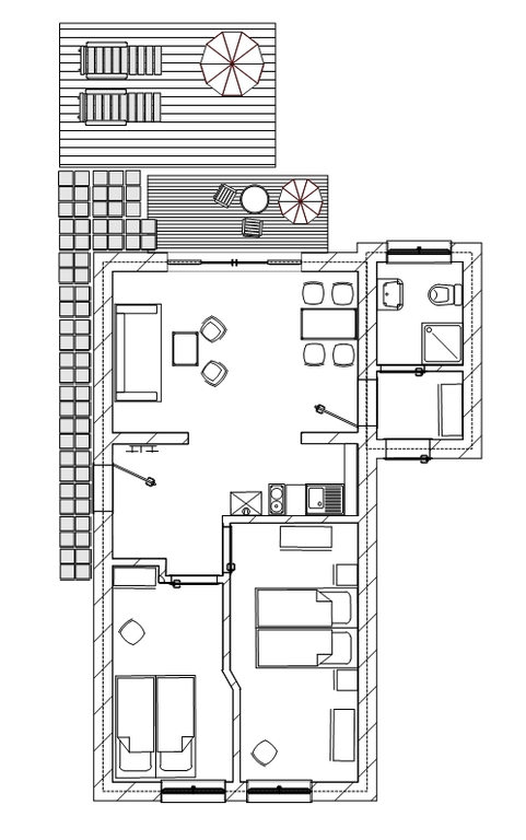 Die Ausstattung im Überblick: 1 Schlafzimmer mit Doppelbett (1,60 x 1,90 m), 1 Schlafzimmer mit Doppelbett (1,40 x 2,00 m) , Küchenzeile im Wohnbereich (2-Platten-Ceranfeld, Spülbecken, Geschirrspüler, Kühlschrank mit sep. Tiefkühlfach, Kaffeemaschine, Toaster, Minibackofen, Mikrowelle, Wasserkocher, Duschbad, Balkon und Terrasse mit Seeblick (Sonnenliegen, direkter Zugang zum See), Sat-TV, Radio, DVD/CD-Player, W-Lan (gebührenfrei).