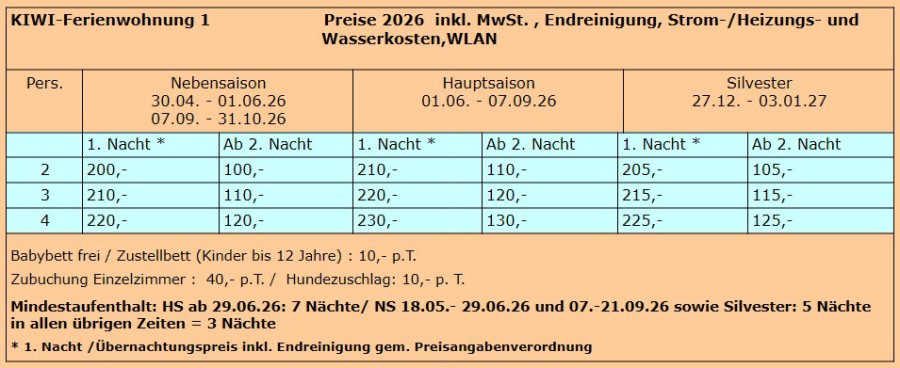 Preisangaben - bitte beachten: In den angegebenen Preisen für die Ferienwohnungen ist die bei Anreise zu entrichtende Kurabgabe in Höhe von 1,00 € pro Person und Tag nicht berücksichtigt. (50 % Ermäßigung für Schüler, Studenten, Wehrdienst- und Bundesfreiwilligendienstleistende, Auszubildende bis zur Vollendung des 27. Lebensjahres bei Nachweis in geeigneter Form)
