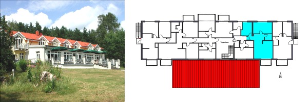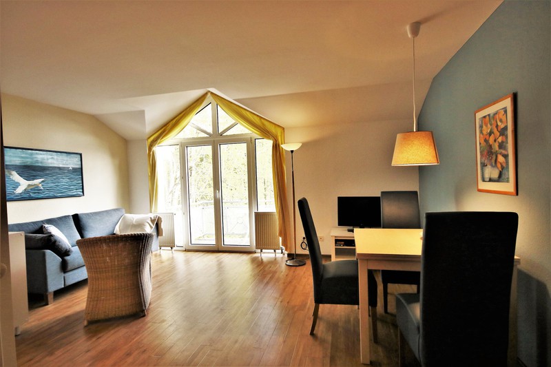 Die Ferienwohnung 3 (57 m²) befindet sich im DG des Hauptgebäudes und verfügt über einen offenen Wohnraum mit einer modernen Küchenzeile und einem gemütlichen Wohnbereich mit Sofa, Sessel, zwei Schlafzimmer - zur kühleren Waldseite - sowie ein Bad mit Dusche und WC.