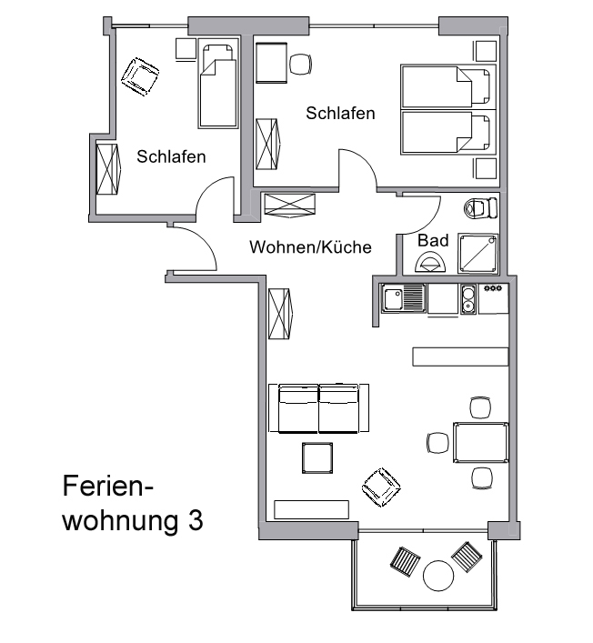 Ausstattungsübersicht: 1 Schlafzimmer mit Doppelbett, 1 Schlafzimmer mit 1 Einzelbett, Küchenzeile im Wohnbereich (2-Platten-Ceranfeld, Spülbecken, Geschirrspüler, Kühlschrank mit sep. Tiefkühlfach, Kaffeemaschine, Toaster, Mikrowelle, Minibackofen, Wasserkocher), Duschbad, Balkon mit Seeblick , Sat-TV, Radio, DVD/CD-Player, W-Lan (gebührenfrei).