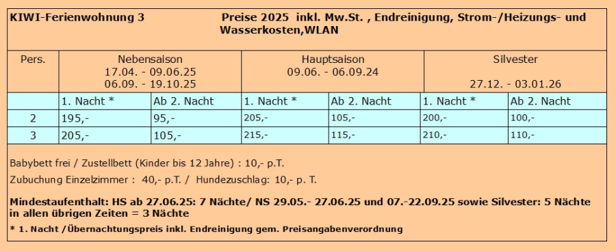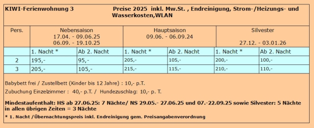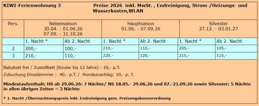 Preisangaben - bitte beachten: In den angegebenen Preisen für die Ferienwohnungen ist die bei Anreise zu entrichtende Kurabgabe in Höhe von 1,00 € pro Person und Tag nicht berücksichtigt. (50 % Ermäßigung für Schüler, Studenten, Wehrdienst- und Bundesfreiwilligendienstleistende, Auszubildende bis zur Vollendung des 27. Lebensjahres bei Nachweis in geeigneter Form)