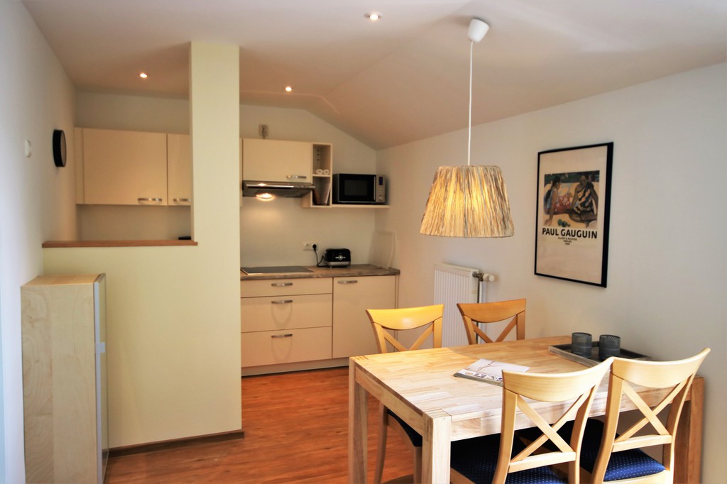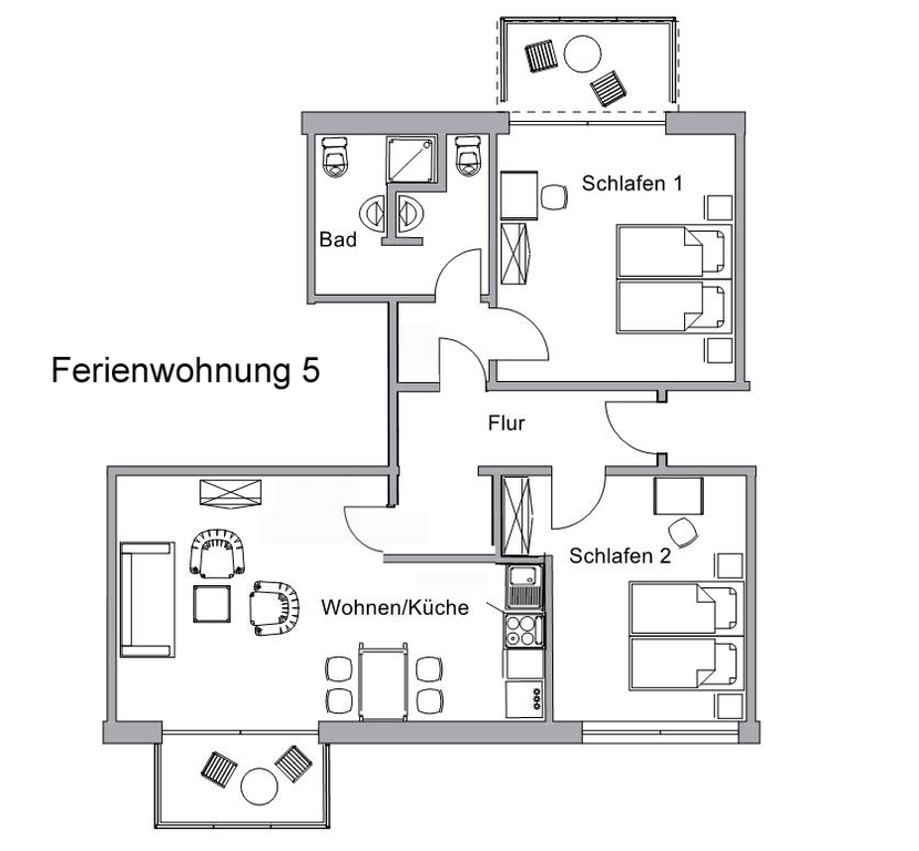 Die Ferienwohnung 5 ist mit 72 m² unsere größte Wohnung mit zwei Balkonen im DG des Hauptgebäudes; sie verfügt über einen offenen Wohnraum mit Süd-Balkon, eine moderne Küchenzeile und eine gemütliche Sitzecke , zwei Schlafzimmer sowie ein großzügiges Bad mit zwei Waschbecken, Dusche und WC.