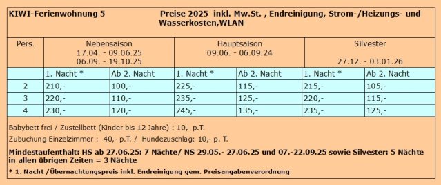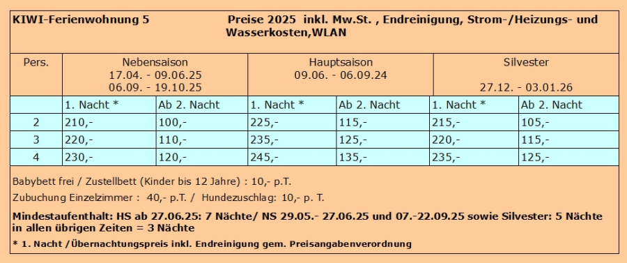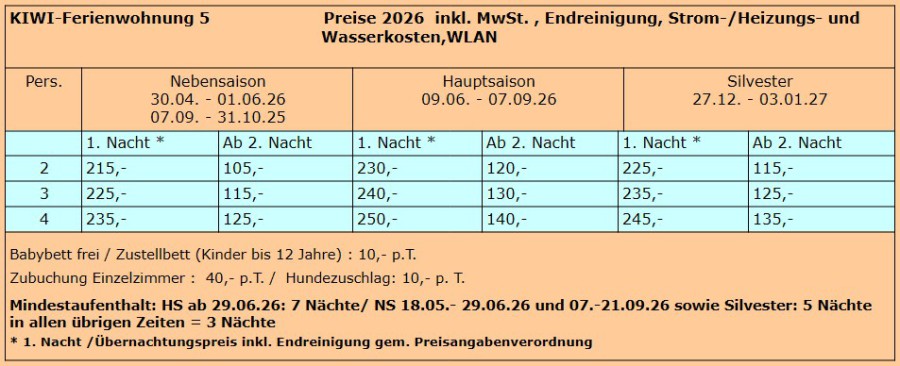 Preisangaben - bitte beachten: In den angegebenen Preisen für die Ferienwohnungen ist die bei Anreise zu entrichtende Kurabgabe in Höhe von 1,00 € pro Person und Tag nicht berücksichtigt. (50 % Ermäßigung für Schüler, Studenten, Wehrdienst- und Bundesfreiwilligendienstleistende, Auszubildende bis zur Vollendung des 27. Lebensjahres bei Nachweis in geeigneter Form)