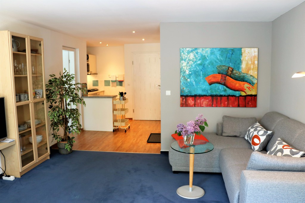 Ausstattungsübersicht: 1 Schlafzimmer mit Doppelbett, Küchenzeile im Wohnbereich (2-Platten-Induktionsherd, Spülbecken, Geschirrspüler, Kühlschrank mit sep. Tiefkühlfach, Kaffeemaschine, Toaster, Mikrowelle, Minibackofen, Wasserkocher), Duschbad, Balkon mit Seeblick , Sat-TV, Radio, DVD/CD-Player, W-Lan (gebührenfrei).