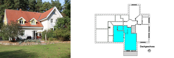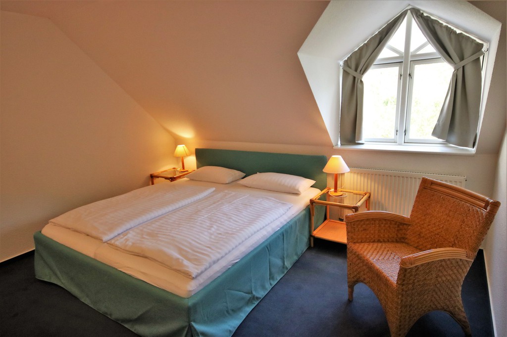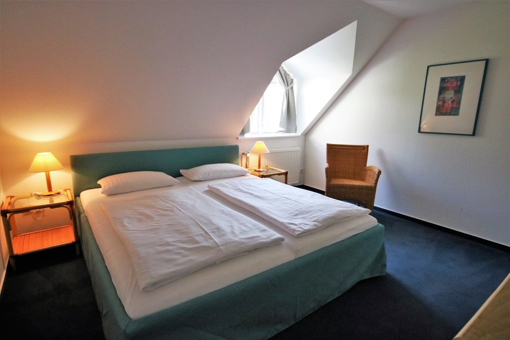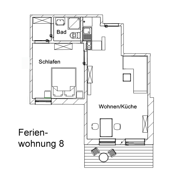 Die Ferienwohnung 8 (ca. 43 m²) befindet sich im DG des Nebengebäudes und verfügt über einen offenen Wohnraum mit einer modernen Küchenzeile und einer gemütlichen Sitzecke, ein Schlafzimmer mit Doppelbett sowie ein Bad mit Dusche und WC.