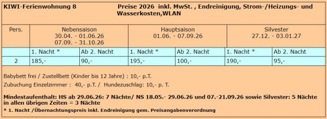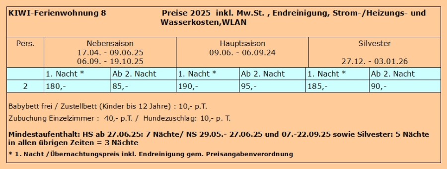 Preisangaben - bitte beachten: In den angegebenen Preisen für die Ferienwohnungen ist die bei Anreise zu entrichtende Kurabgabe in Höhe von 1,00 € pro Person und Tag nicht berücksichtigt. (50 % Ermäßigung für Schüler, Studenten, Wehrdienst- und Bundesfreiwilligendienstleistende, Auszubildende bis zur Vollendung des 27. Lebensjahres bei Nachweis in geeigneter Form)